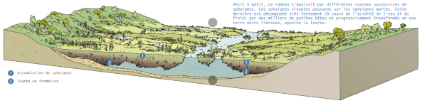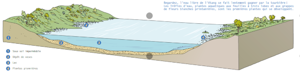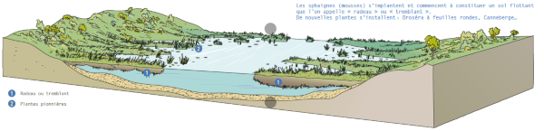 Les zones de tremblants, milieux rares et fragiles reposant sur l’eau, sont les premiers stade de comblement des zones en eau libre. Au développement du Menyanthe trèfle d’eau, succède celui des Sphaignes qui constituent la tourbière de transition. Ce milieu abrite aussi la Drosera à feuilles rondes qui est une espèce végétale carnivore protégée sur le plan national